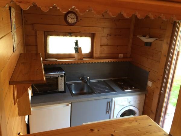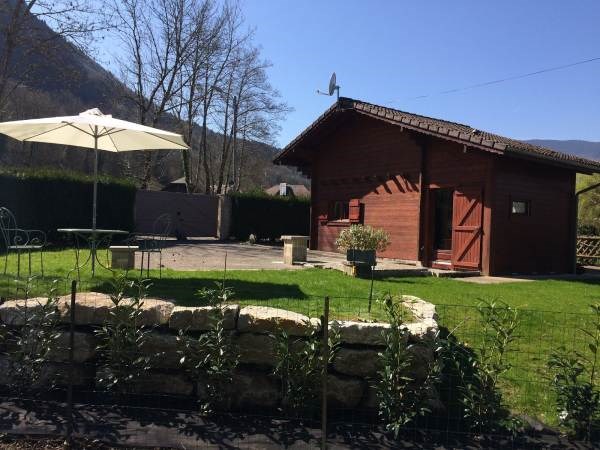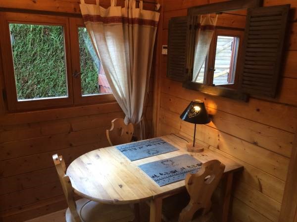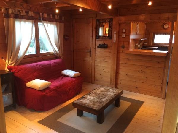 Petit chalet madriers bois sur terrain clos 500m2, à 800 mètres de la plage gratuite et du centre de voile. Environnement champêtre, espace extérieur avec pelouse et parking et terrasses + mobiliers de jardin.